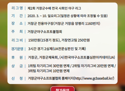 리 그 명 : 제2회 거창군수배 전국 사회인 야구리그기 간 : 2020. 03. ~ 11. 일요리그..