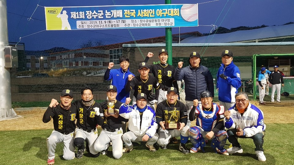 거창군 야구협회 소속 연합팀이(협회장 유석민)이 11월 9일부터 17일까지 펼쳐진 ‘제1회 장수군 논개배 전국사회인야구대회’에서 영광의 우승컵을 들어올렸다.