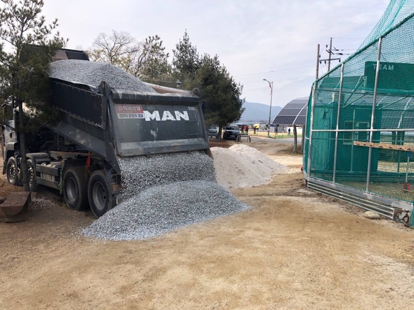 현재 1루 덕아웃 방향 자갈 설치 및 주 출입구(현 컨테이너방향) 마사토 평탄작업 예정 입니다.