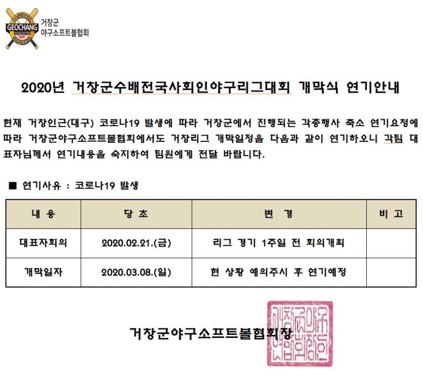 2020년 거창군수배전국사회인야구리그 개막식 연기안내